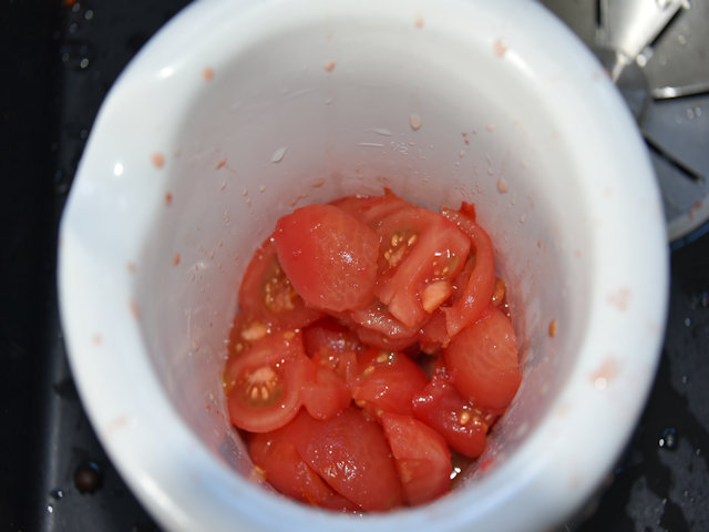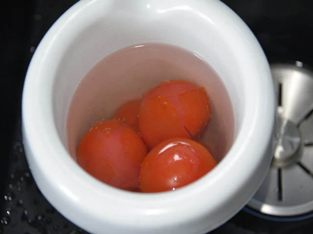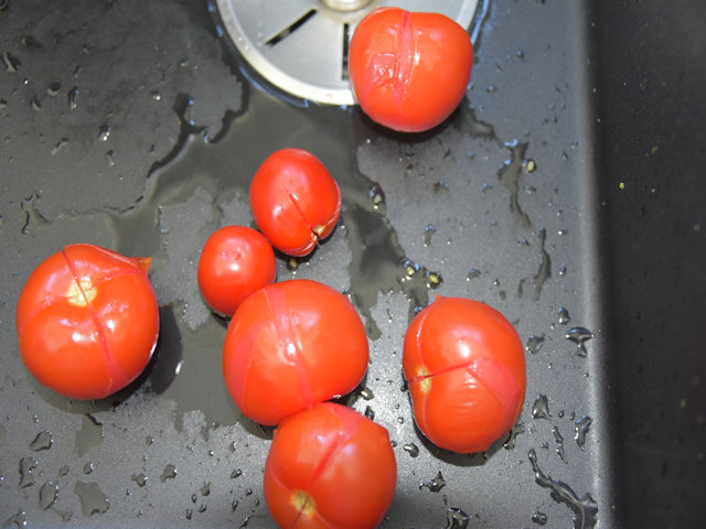 Die frischen Tomaten an Stilansatz kreuweise einschneiden in eine hohe