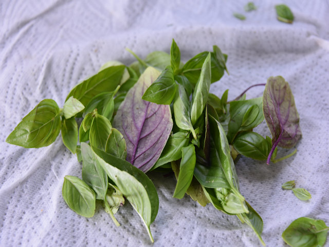 Das Basilikum mit einem Küchentusch ggf. trockentupfen. Hier habe
