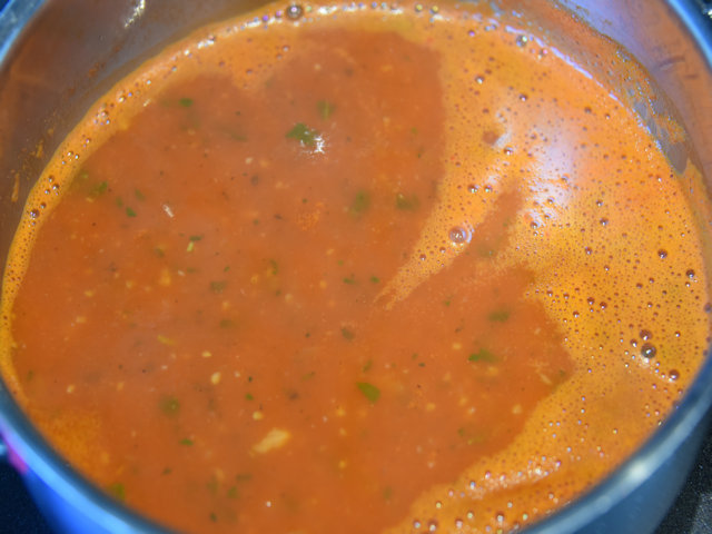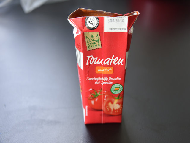 Die Frischen Tomaten hinzugeben, danach die gekauften, pürierten Tomaten hinzugeben und eine 1/4 h lang kochen lassen