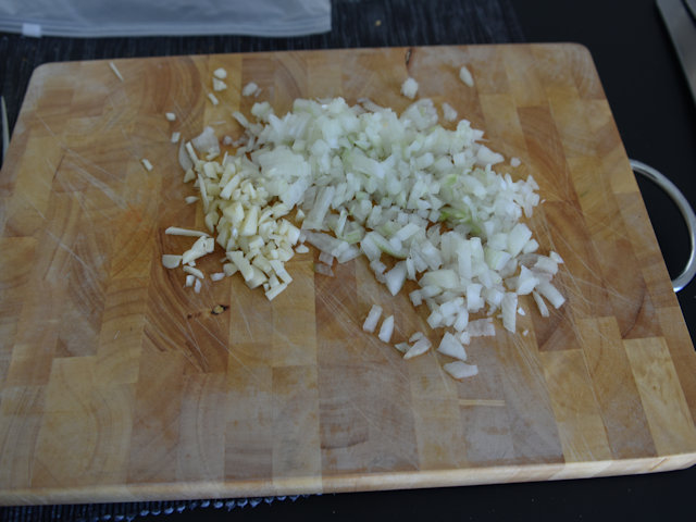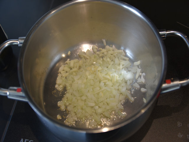 In einem "flachen" Top Öl erhitzen, dann die Zwiebel und den Knoblauch hinzugeben und andünsten. Die Zweibeln müssen glasiert und kross sein,