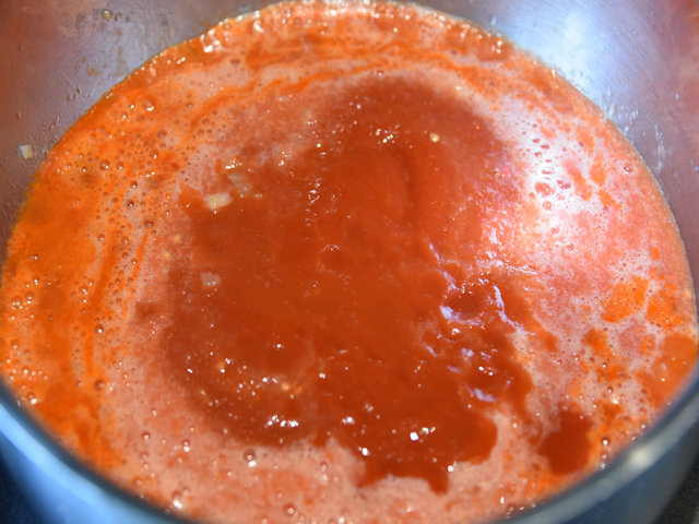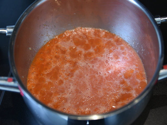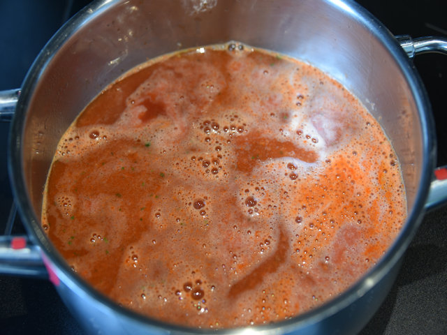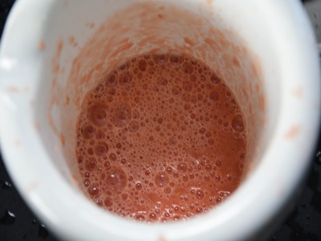 pürieren. Die Farbe ändert sich dann auf hellrot, die Masse ist flüssig