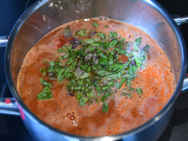 Das Basilikum hinzugeben, mit einem Rührstab auf gewünschte Konsistenz pürieren. ggf. Tomatenmark hinzugeben, wenn die Suppe zu dünn ist.